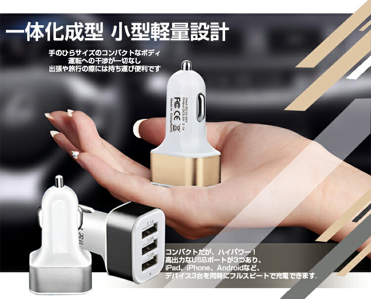 【商品キーワード】iPhone8 8plus カーチャージャー 車載 充電器 シガーソケット シガーソケット シガーライターソケット 3ポート 3口 3連 12V 24V USBシガーソケット充電器 車用 車 充電器 USB 同時充電 超小型 高出力 iphone iphone7 iphone6 iphone6splus用 スマホ充電器製品仕様 対応機種: スマトートフォンからタブレットまでのUSBデバイス機種対応 サイズ: 長さ:6.4cm 幅:3.5cm 高さ:2.5cm 本体重量: 約23g カラー: シルバー、ブラック、ゴールド 備考: 関連商品 2口シガーソケット カーチャージャー 車載スマホホルダー 車載スマホスタンド 吸盤式ホルダー 発送方法 ・お求め安い価格を実現するため、当店では基本的にメール便(ヤマトDM便、ゆうパケットまたは定形外)で配送させて頂いております。