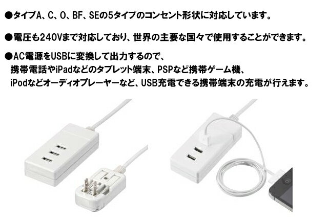 【検索ワード】 トラベル用品/トラベルグッズ/トラベル小物/旅行小物/旅行雑貨/トラベル雑貨/電化製品/海外旅行グッズ/変形プラグ/プラグ形状変換/差し込みプラグ/マルチプラグ/USBタップ/USBポート/国外使用/外国/海外使用/タコ足/たこ足/USB3個口/スマホ充電/スマートフォン充電/Android充電/アンドロイド/iPhone充電/USB充電/ゲーム機/カメラ充電/デジカメ充電/AC110-240V対応/3個口/3口/3箇所/3個同時/【RCP】 タイプA、C、O、BF、SEの5タイプのコンセント形状に対応しています。