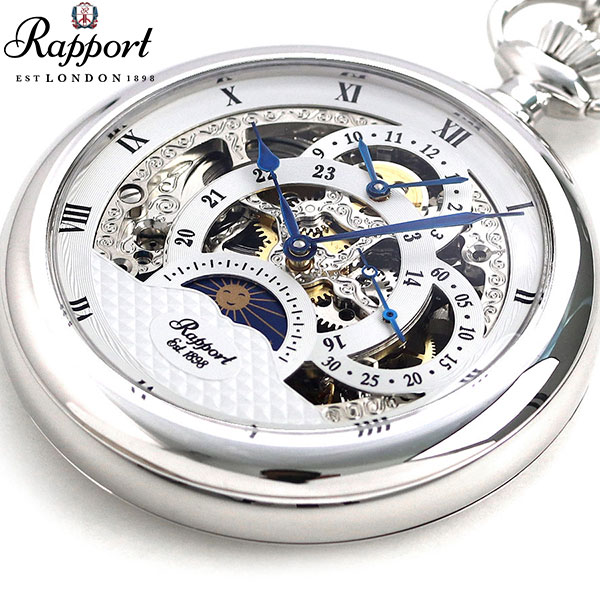 【15日は全品5倍でポイント最大27倍】 ラポート 懐中時計 デュアルタイム サン&ムーン オープンフェイス イギリス製 手巻き PW43 シルバー 時計
